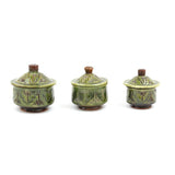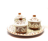 This tray is useful on the kitchen counter or table, to store everyday ingredients like tea, sugar, coffee, grains... The motifs are hand engraved in the colour pigment reflecting the tones of the clay. The tray comprises 3 pots in different sizes and exists in 2 colours.