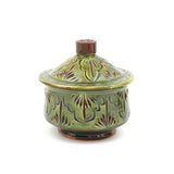 This beautiful pottery is handmade in the village of Tamegroute, a small village in the Draa Valley in Morocco. The particular green colour is a characteristic of this region, where the copper and the natural clay from the Draa river meet. The colour is therefore from natural colour pigment.