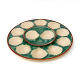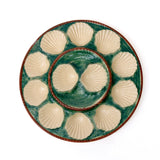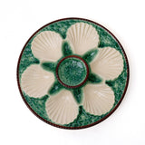 A rare set of 12 ceramic oyster plates and a platter from "Chantilly Longchamps" , a French earthenware with green and white slip decorations, often topped with a glossy finish. These plates are designed with indentations for oysters and a space for lemon or sauces, reminiscent of seafood services.
