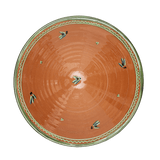 Brown glaze with small olive and olive leaf motifs inside, and green on the outside.